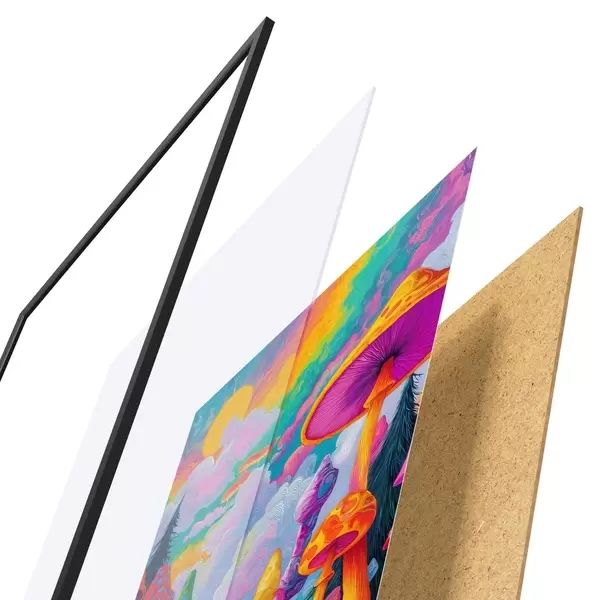 Plakát se skládá z rámu, plexiskla, tištěného obrazu a dřevotřískového podkladu. Díky úchytům na zadní straně lze plakát ihned zavěsit na zeď.