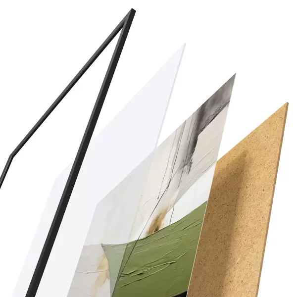 Plakát se skládá z rámu, plexiskla, tištěného obrazu a dřevotřískového podkladu. Díky úchytům na zadní straně lze plakát ihned zavěsit na zeď.