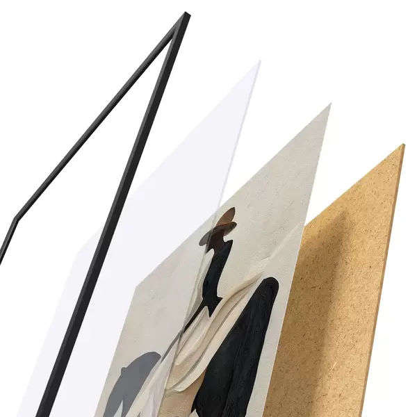 Plakát se skládá z rámu, plexiskla, tištěného obrazu a dřevotřískového podkladu. Díky úchytům na zadní straně lze plakát ihned zavěsit na zeď.
