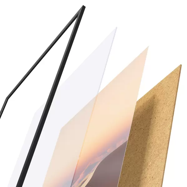 Plakát se skládá z rámu, plexiskla, tištěného obrazu a dřevotřískového podkladu. Díky úchytům na zadní straně lze plakát ihned zavěsit na zeď.