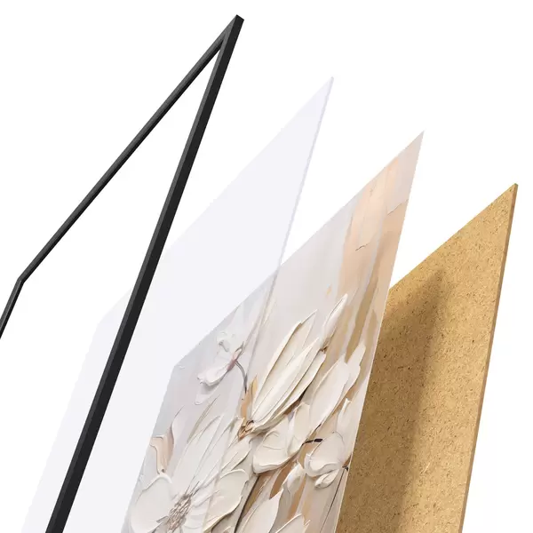 Plakát se skládá z rámu, plexiskla, tištěného obrazu a dřevotřískového podkladu. Díky úchytům na zadní straně lze plakát ihned zavěsit na zeď.