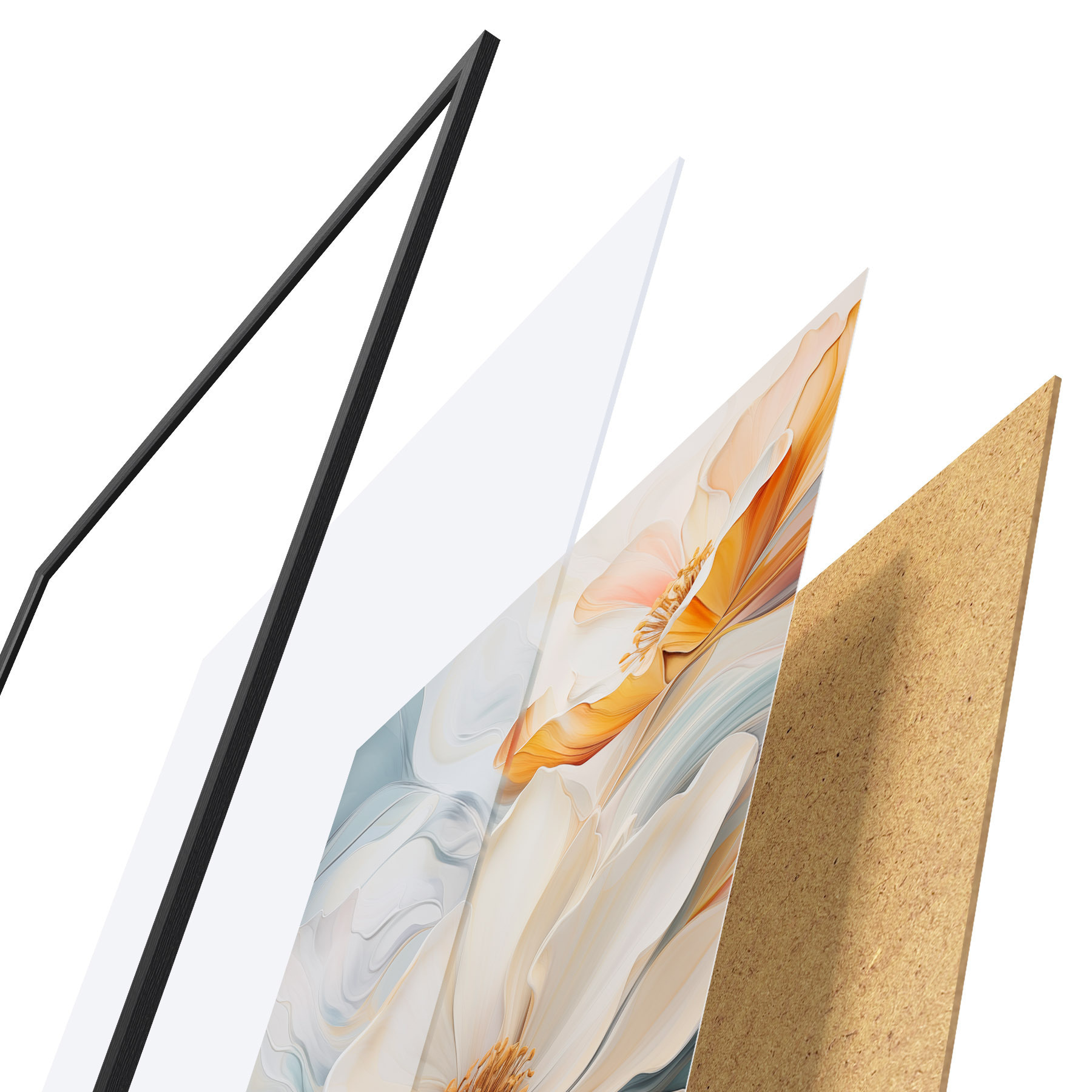 Plakát se skládá z rámu, plexiskla, tištěného obrazu a dřevotřískového podkladu. Díky úchytům na zadní straně lze plakát ihned zavěsit na zeď.