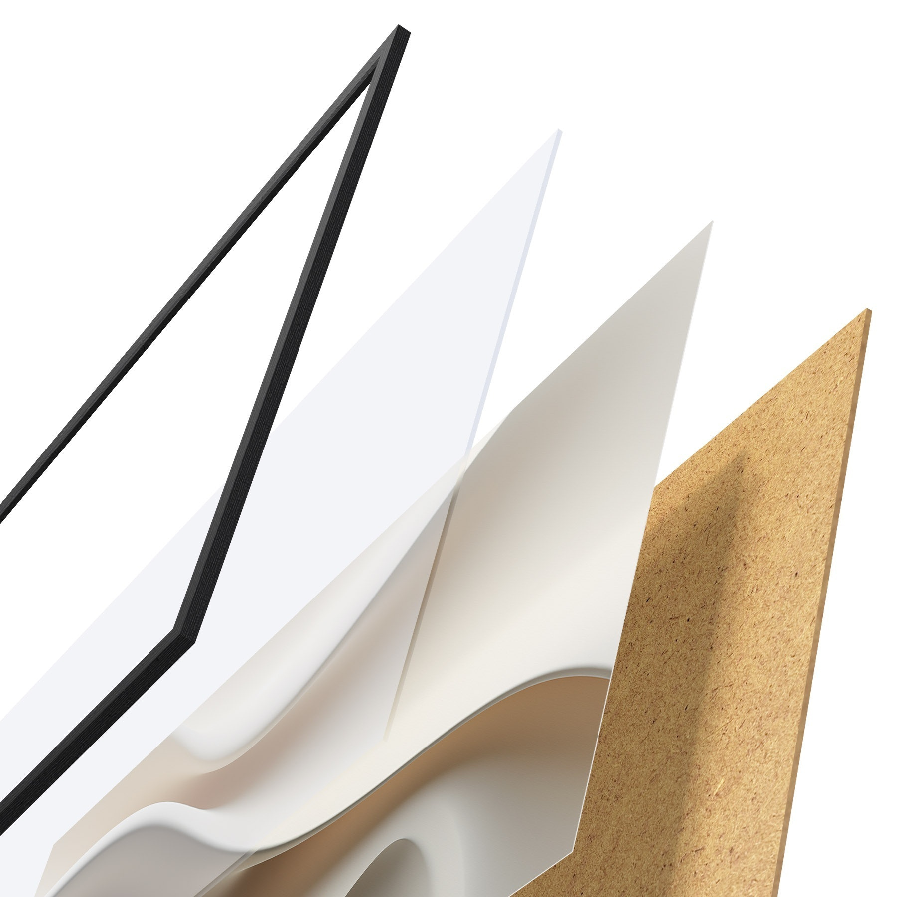Plakát se skládá z rámu, plexiskla, tištěného obrazu a dřevotřískového podkladu. Díky úchytům na zadní straně lze plakát ihned zavěsit na zeď.