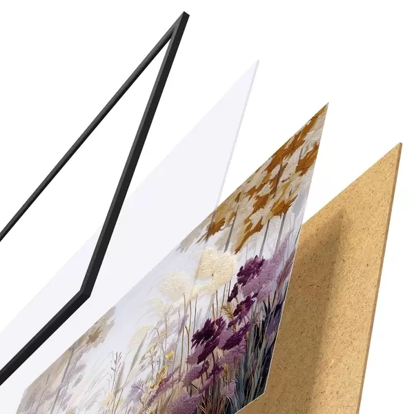 Plakát se skládá z rámu, plexiskla, tištěného obrazu a dřevotřískového podkladu. Díky úchytům na zadní straně lze plakát ihned zavěsit na zeď.