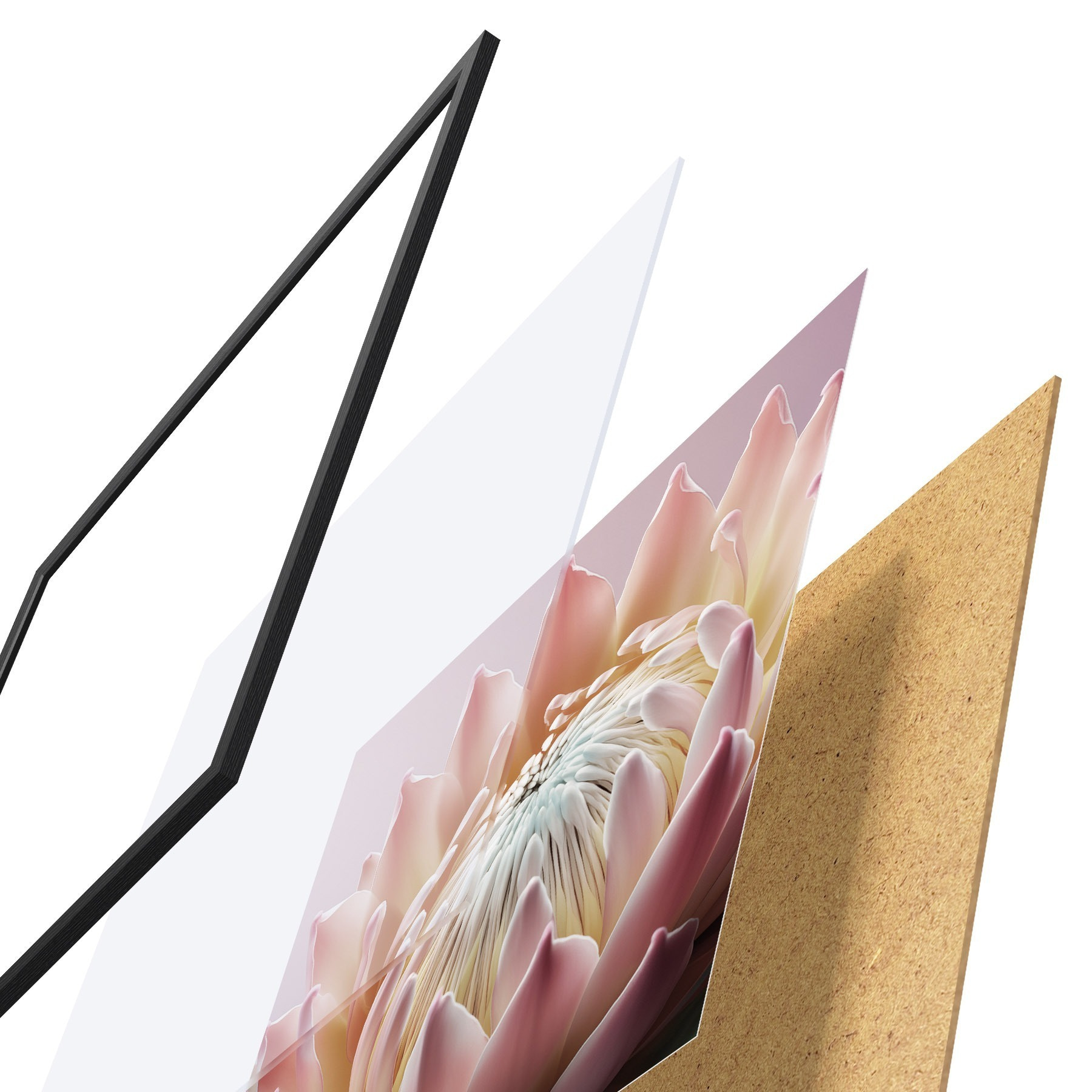 Plakát se skládá z rámu, plexiskla, tištěného obrazu a dřevotřískového podkladu. Díky úchytům na zadní straně lze plakát ihned zavěsit na zeď.