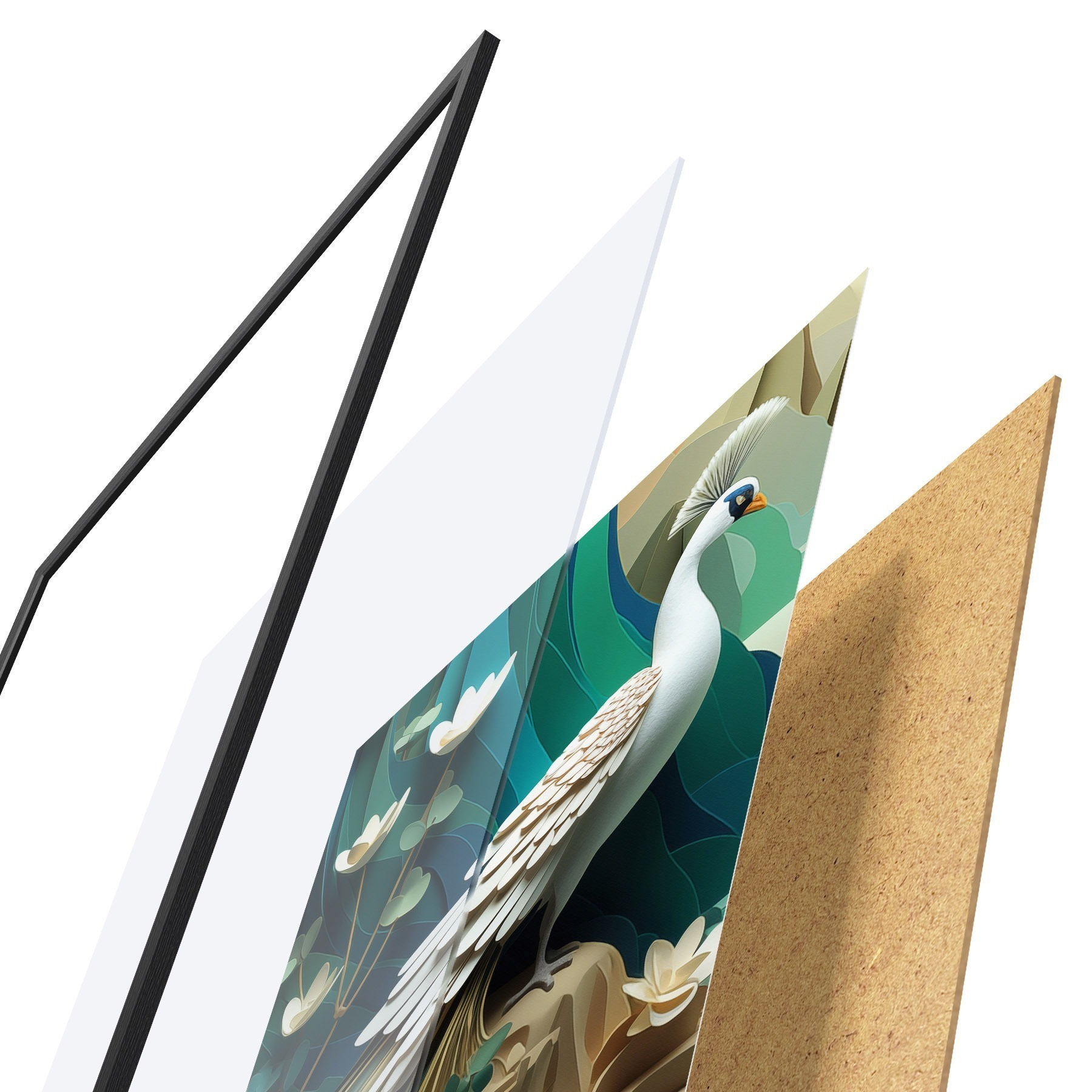 Plakát se skládá z rámu, plexiskla, tištěného obrazu a dřevotřískového podkladu. Díky úchytům na zadní straně lze plakát ihned zavěsit na zeď.