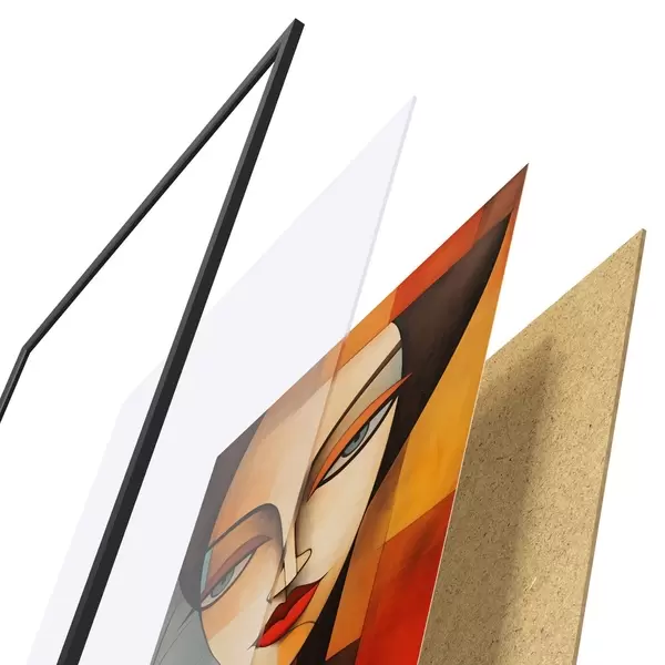 Plakát se skládá z rámu, plexiskla, tištěného obrazu a dřevotřískového podkladu. Díky úchytům na zadní straně lze plakát ihned zavěsit na zeď.
