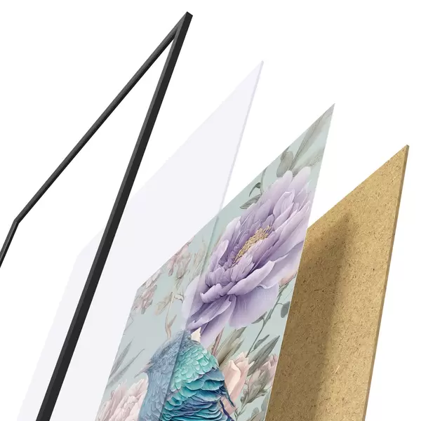 Plakát se skládá z rámu, plexiskla, tištěného obrazu a dřevotřískového podkladu. Díky úchytům na zadní straně lze plakát ihned zavěsit na zeď.