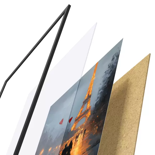 Plakát se skládá z rámu, plexiskla, tištěného obrazu a dřevotřískového podkladu. Díky úchytům na zadní straně lze plakát ihned zavěsit na zeď.