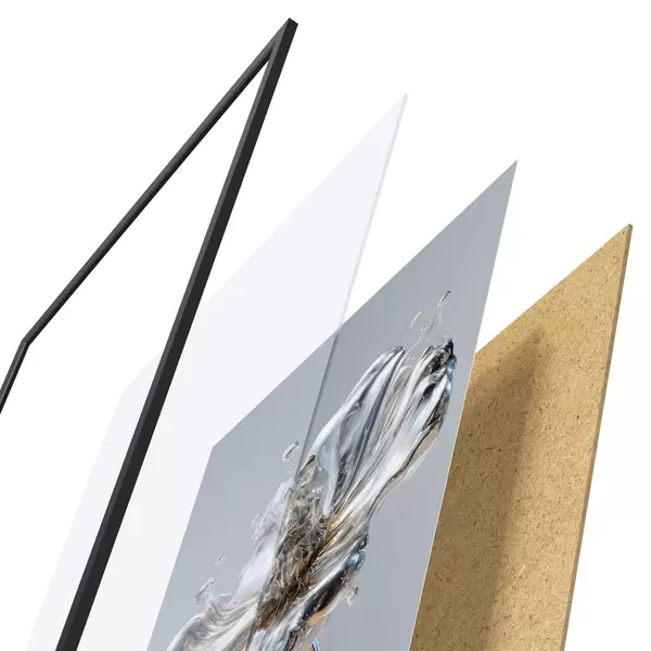 Plakát se skládá z rámu, plexiskla, tištěného obrazu a dřevotřískového podkladu. Díky úchytům na zadní straně lze plakát ihned zavěsit na zeď.