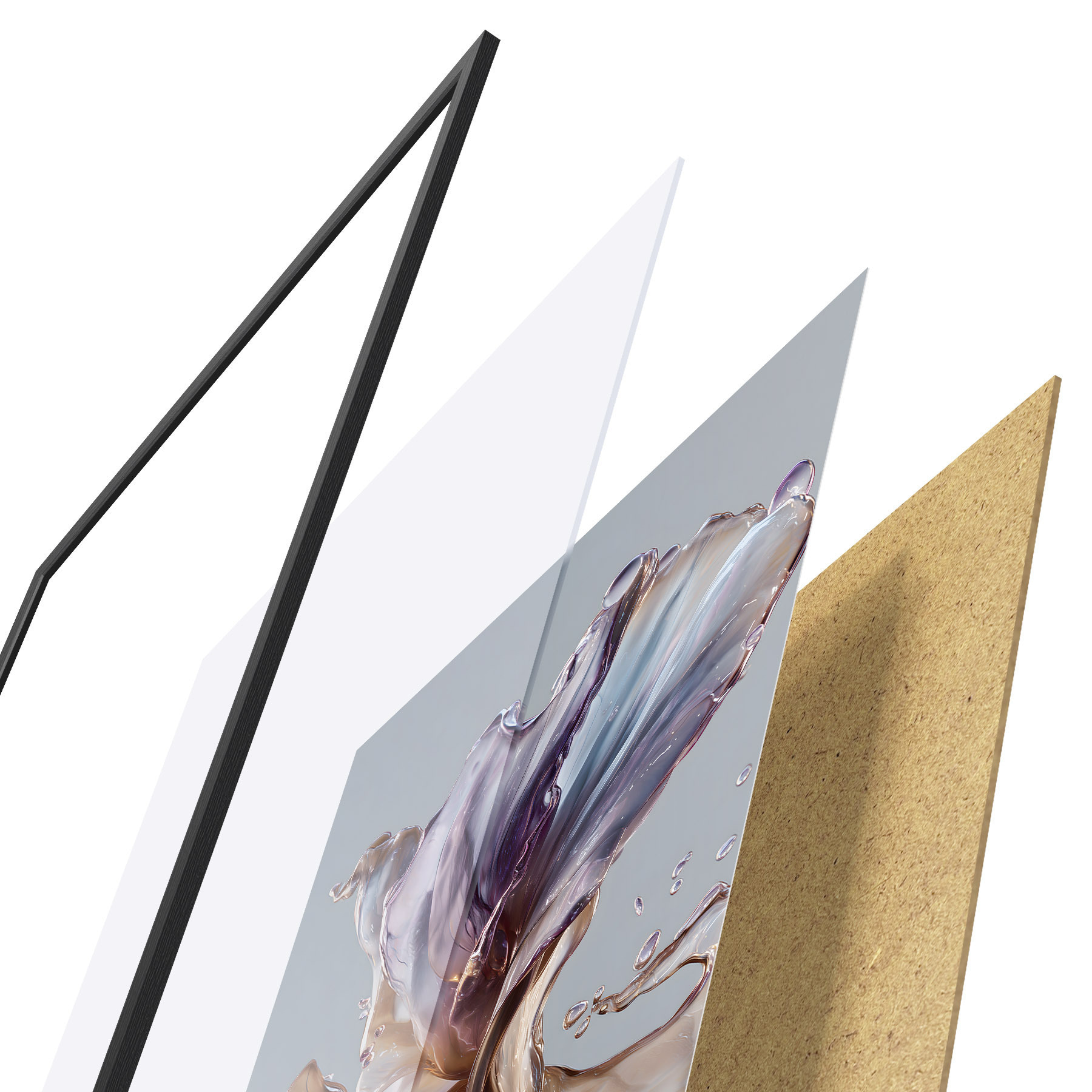 Plakát se skládá z rámu, plexiskla, tištěného obrazu a dřevotřískového podkladu. Díky úchytům na zadní straně lze plakát ihned zavěsit na zeď.
