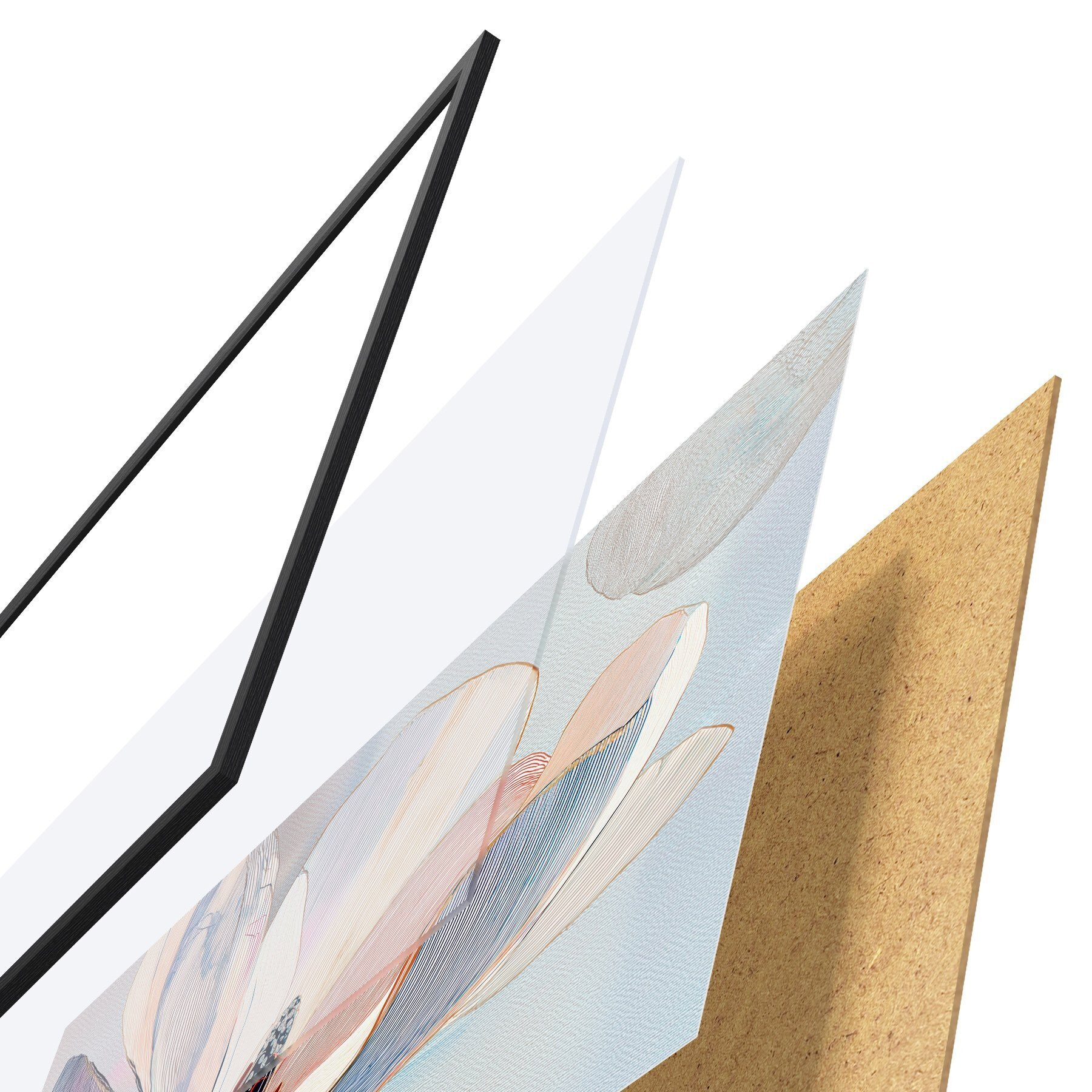 Plakát se skládá z rámu, plexiskla, tištěného obrazu a dřevotřískového podkladu. Díky úchytům na zadní straně lze plakát ihned zavěsit na zeď.