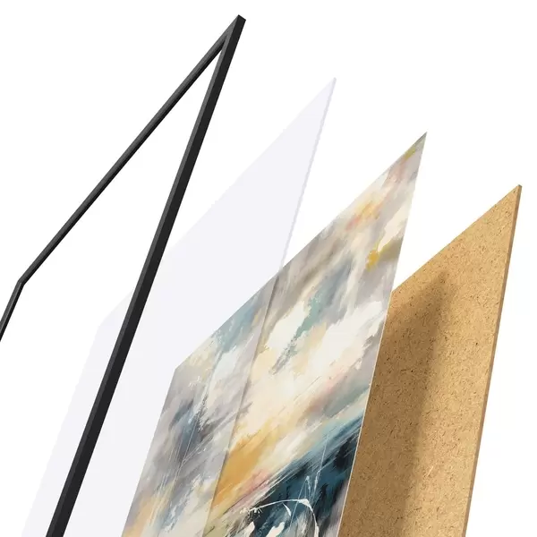 Plakát se skládá z rámu, plexiskla, tištěného obrazu a dřevotřískového podkladu. Díky úchytům na zadní straně lze plakát ihned zavěsit na zeď.