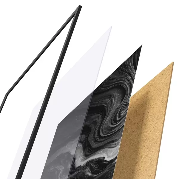 Plakát se skládá z rámu, plexiskla, tištěného obrazu a dřevotřískového podkladu. Díky úchytům na zadní straně lze plakát ihned zavěsit na zeď.