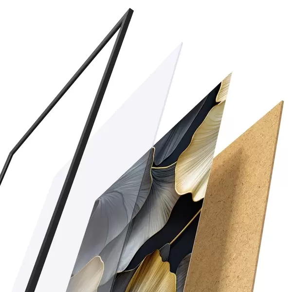 Plakát se skládá z rámu, plexiskla, tištěného obrazu a dřevotřískového podkladu. Díky úchytům na zadní straně lze plakát ihned zavěsit na zeď.