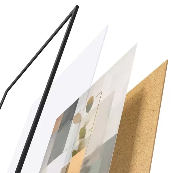 Plakát se skládá z rámu, plexiskla, tištěného obrazu a dřevotřískového podkladu. Díky úchytům na zadní straně lze plakát ihned zavěsit na zeď.