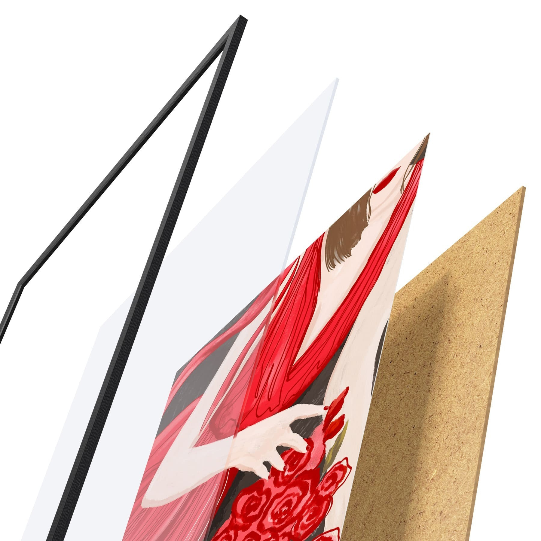 Plakát se skládá z rámu, plexiskla, tištěného obrazu a dřevotřískového podkladu. Díky úchytům na zadní straně lze plakát ihned zavěsit na zeď.