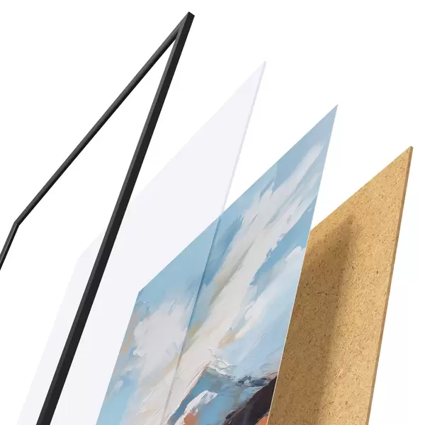 Plakát se skládá z rámu, plexiskla, tištěného obrazu a dřevotřískového podkladu. Díky úchytům na zadní straně lze plakát ihned zavěsit na zeď.