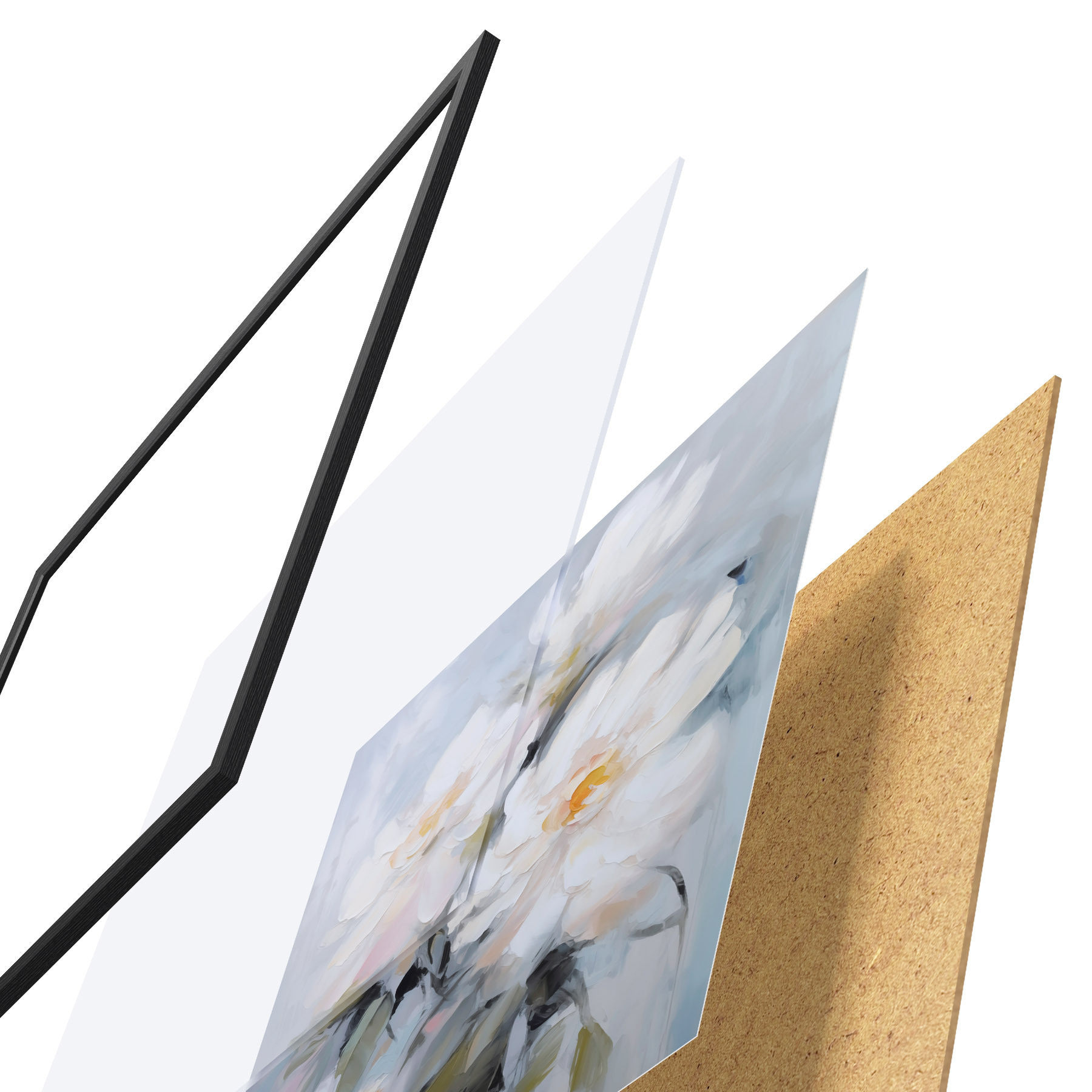Plakát se skládá z rámu, plexiskla, tištěného obrazu a dřevotřískového podkladu. Díky úchytům na zadní straně lze plakát ihned zavěsit na zeď.