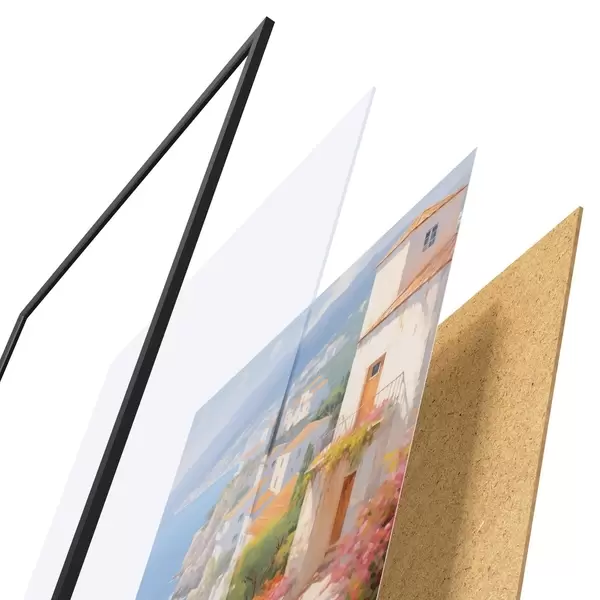Plakát se skládá z rámu, plexiskla, tištěného obrazu a dřevotřískového podkladu. Díky úchytům na zadní straně lze plakát ihned zavěsit na zeď.