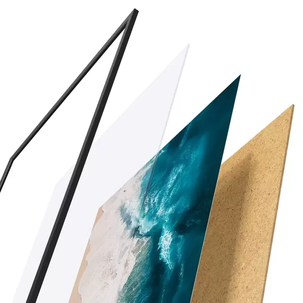Plakát se skládá z rámu, plexiskla, tištěného obrazu a dřevotřískového podkladu. Díky úchytům na zadní straně lze plakát ihned zavěsit na zeď.