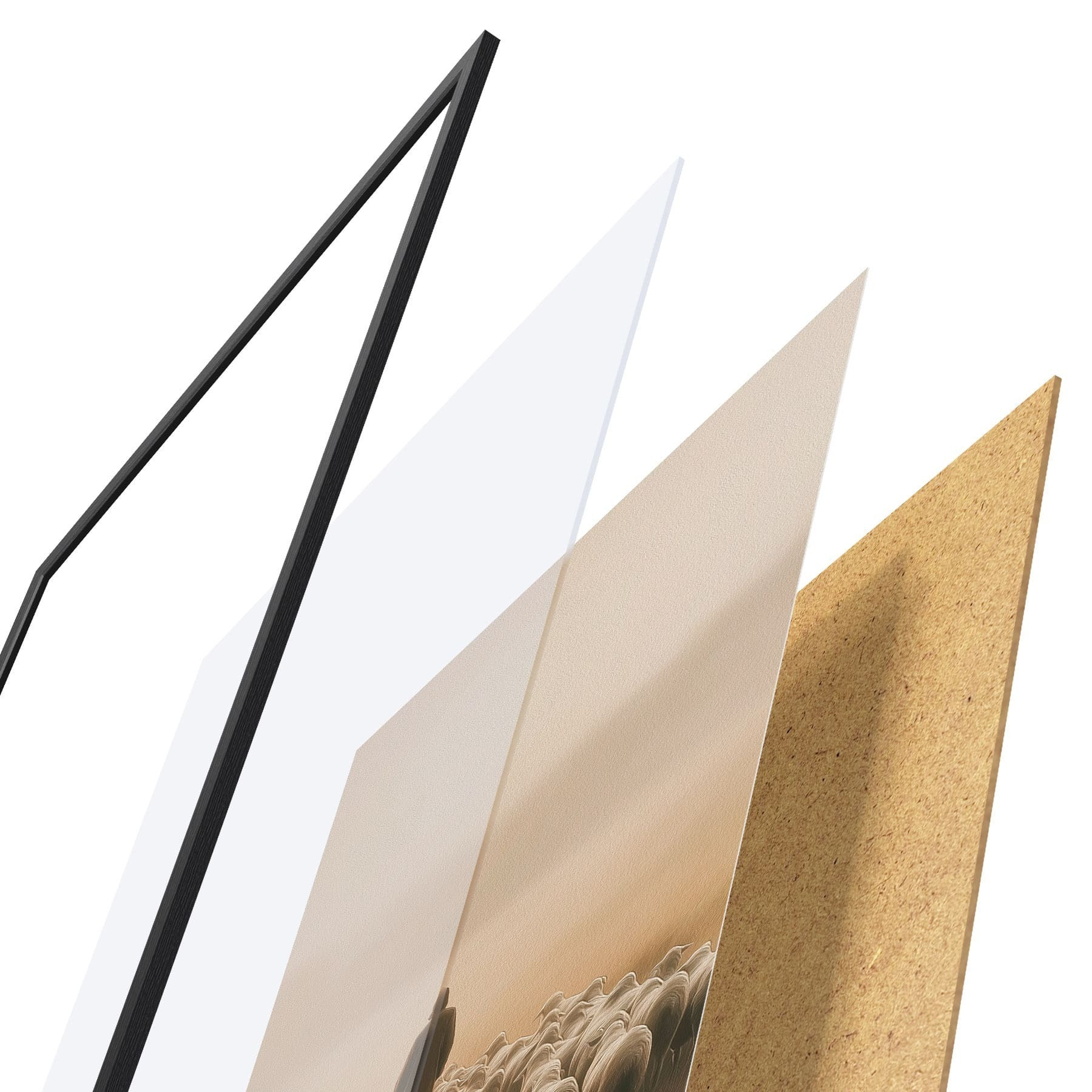 Plakát se skládá z rámu, plexiskla, tištěného obrazu a dřevotřískového podkladu. Díky úchytům na zadní straně lze plakát ihned zavěsit na zeď.