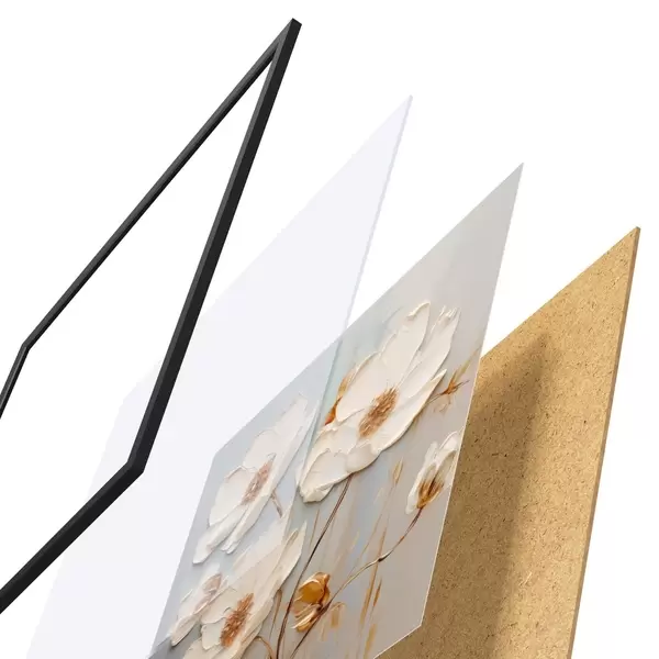 Plakát se skládá z rámu, plexiskla, tištěného obrazu a dřevotřískového podkladu. Díky úchytům na zadní straně lze plakát ihned zavěsit na zeď.