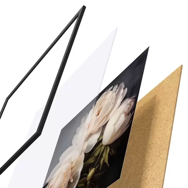 Plakát se skládá z rámu, plexiskla, tištěného obrazu a dřevotřískového podkladu. Díky úchytům na zadní straně lze plakát ihned zavěsit na zeď.
