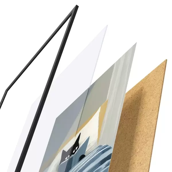 Plakát se skládá z rámu, plexiskla, tištěného obrazu a dřevotřískového podkladu. Díky úchytům na zadní straně lze plakát ihned zavěsit na zeď.