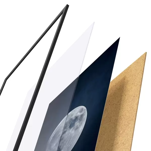 Plakát se skládá z rámu, plexiskla, tištěného obrazu a dřevotřískového podkladu. Díky úchytům na zadní straně lze plakát ihned zavěsit na zeď.