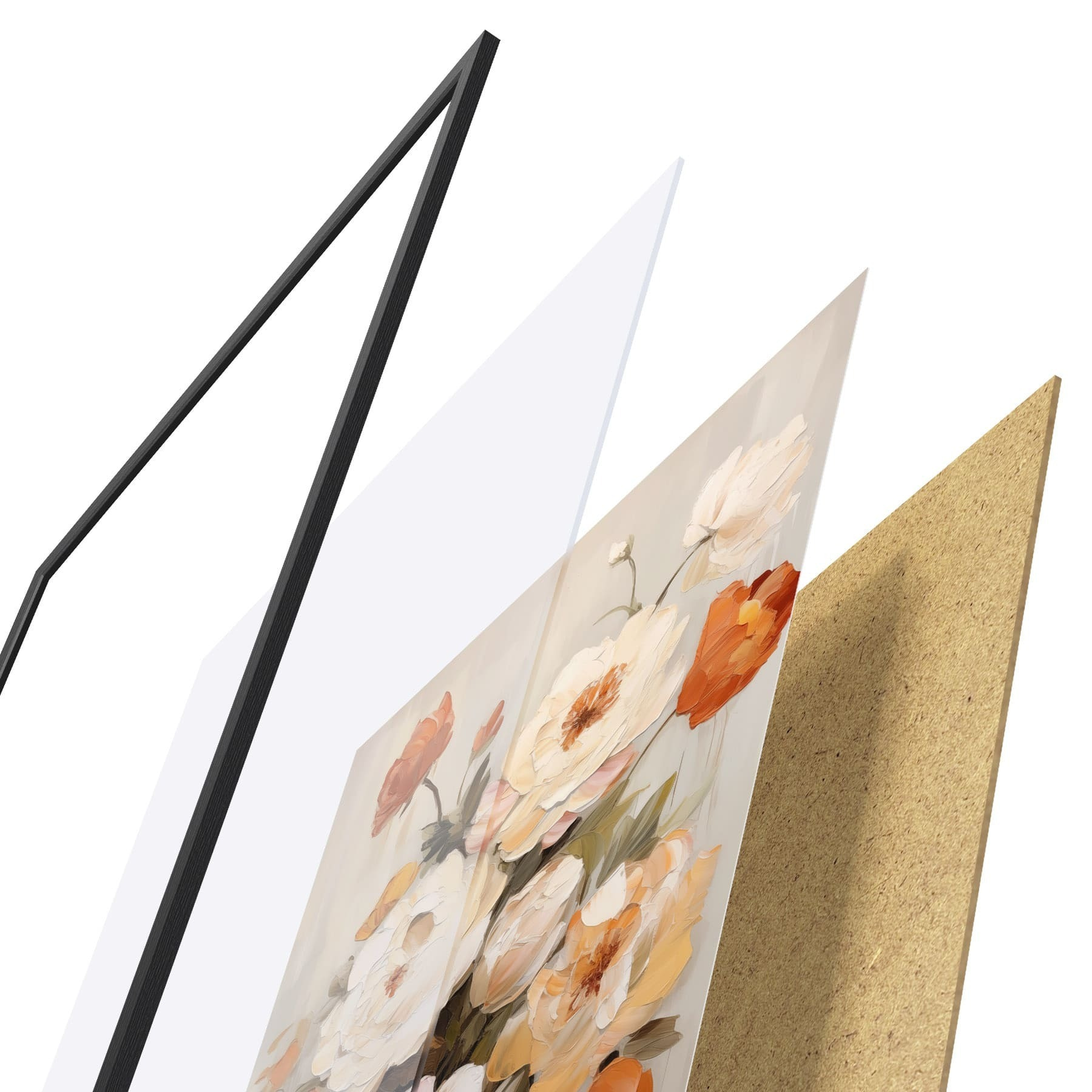 Plakát se skládá z rámu, plexiskla, tištěného obrazu a dřevotřískového podkladu. Díky úchytům na zadní straně lze plakát ihned zavěsit na zeď.