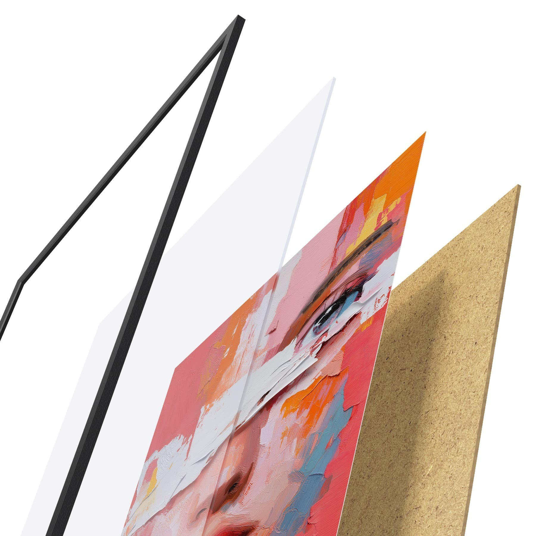 Plakát se skládá z rámu, plexiskla, tištěného obrazu a dřevotřískového podkladu. Díky úchytům na zadní straně lze plakát ihned zavěsit na zeď.