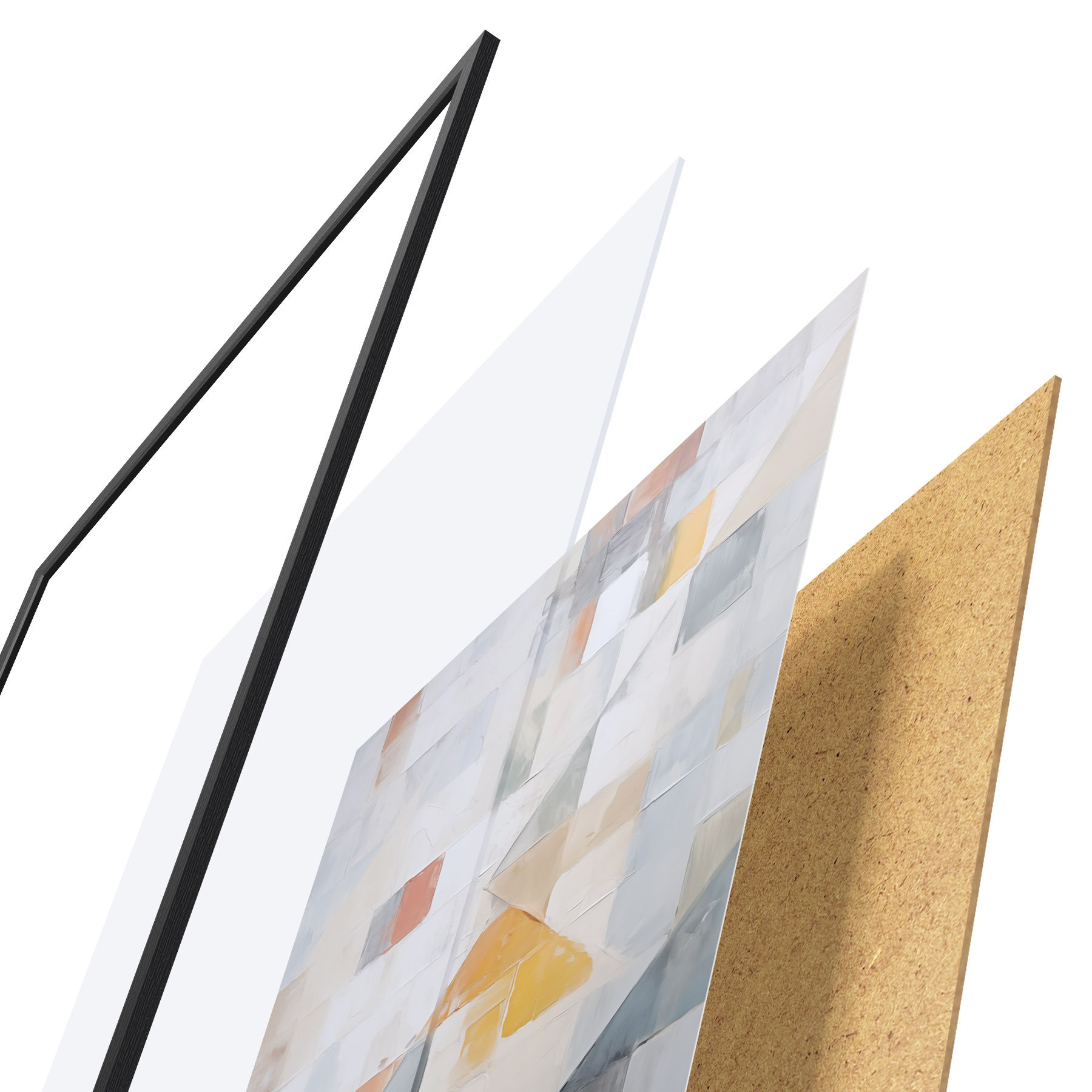 Plakát se skládá z rámu, plexiskla, tištěného obrazu a dřevotřískového podkladu. Díky úchytům na zadní straně lze plakát ihned zavěsit na zeď.