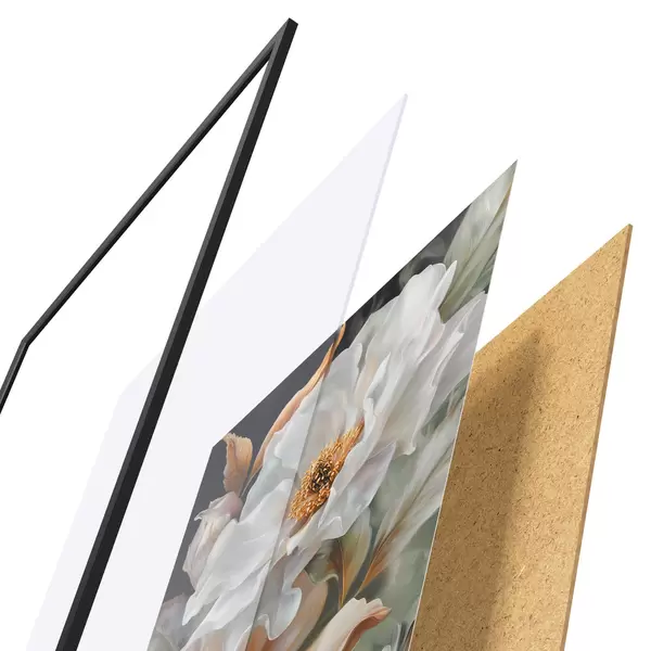 Plakát se skládá z rámu, plexiskla, tištěného obrazu a dřevotřískového podkladu. Díky úchytům na zadní straně lze plakát ihned zavěsit na zeď.