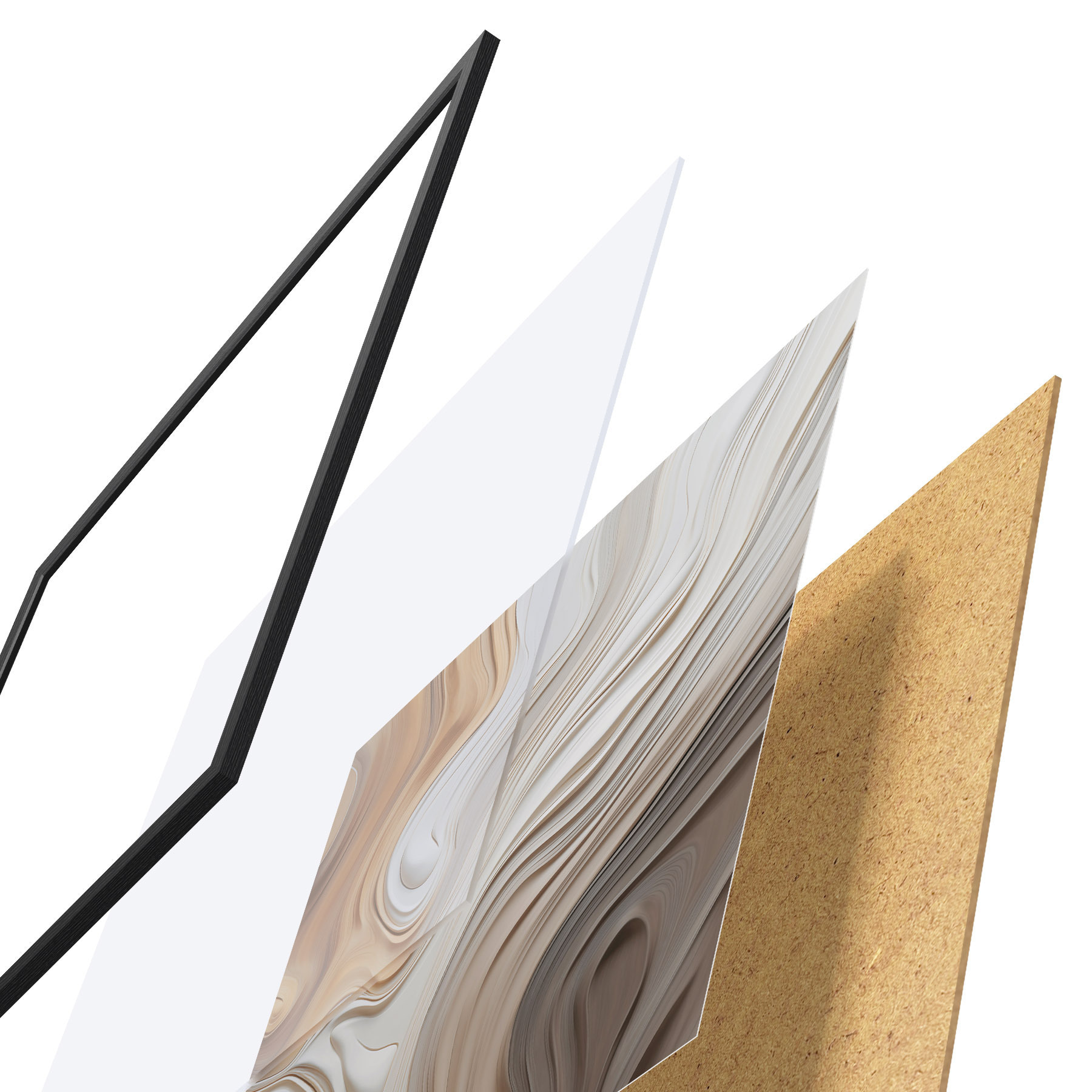 Plakát se skládá z rámu, plexiskla, tištěného obrazu a dřevotřískového podkladu. Díky úchytům na zadní straně lze plakát ihned zavěsit na zeď.