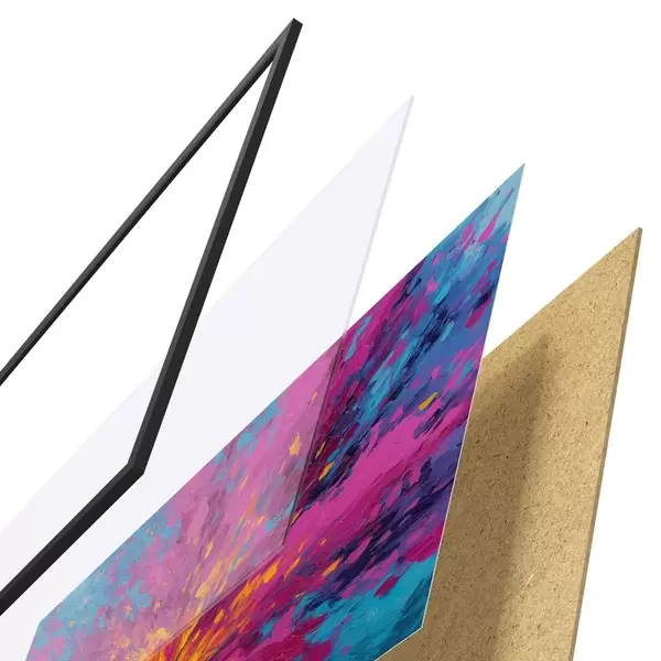 Plakát se skládá z rámu, plexiskla, tištěného obrazu a dřevotřískového podkladu. Díky úchytům na zadní straně lze plakát ihned zavěsit na zeď.