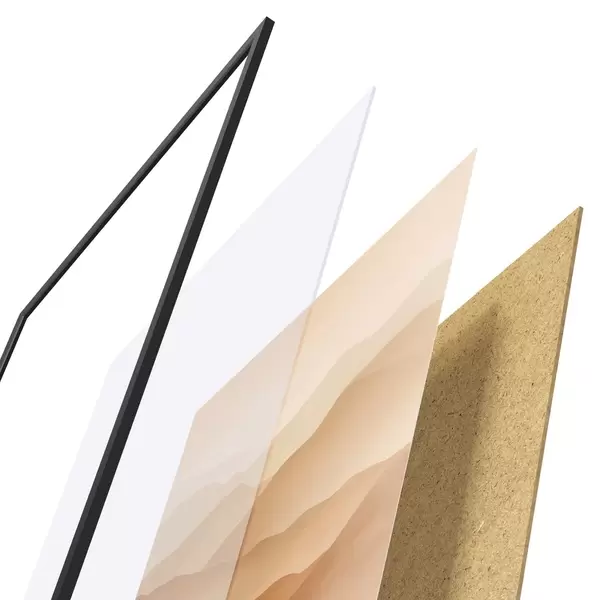 Plakát se skládá z rámu, plexiskla, tištěného obrazu a dřevotřískového podkladu. Díky úchytům na zadní straně lze plakát ihned zavěsit na zeď.