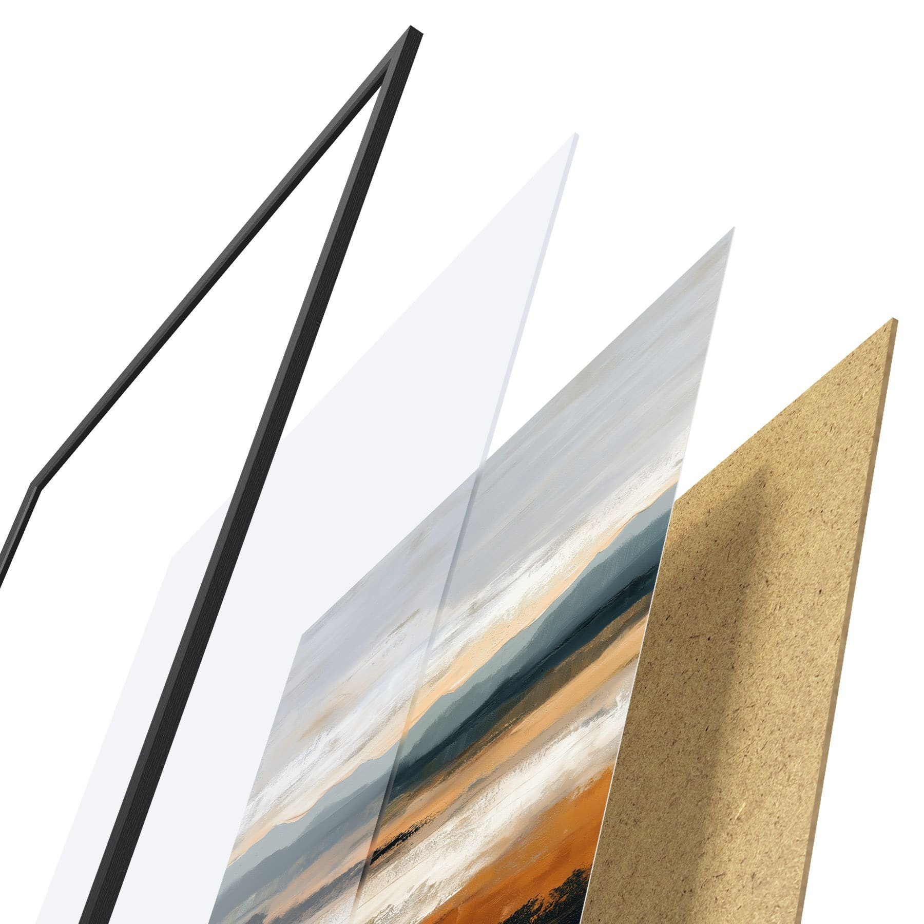 Plakát se skládá z rámu, plexiskla, tištěného obrazu a dřevotřískového podkladu. Díky úchytům na zadní straně lze plakát ihned zavěsit na zeď.