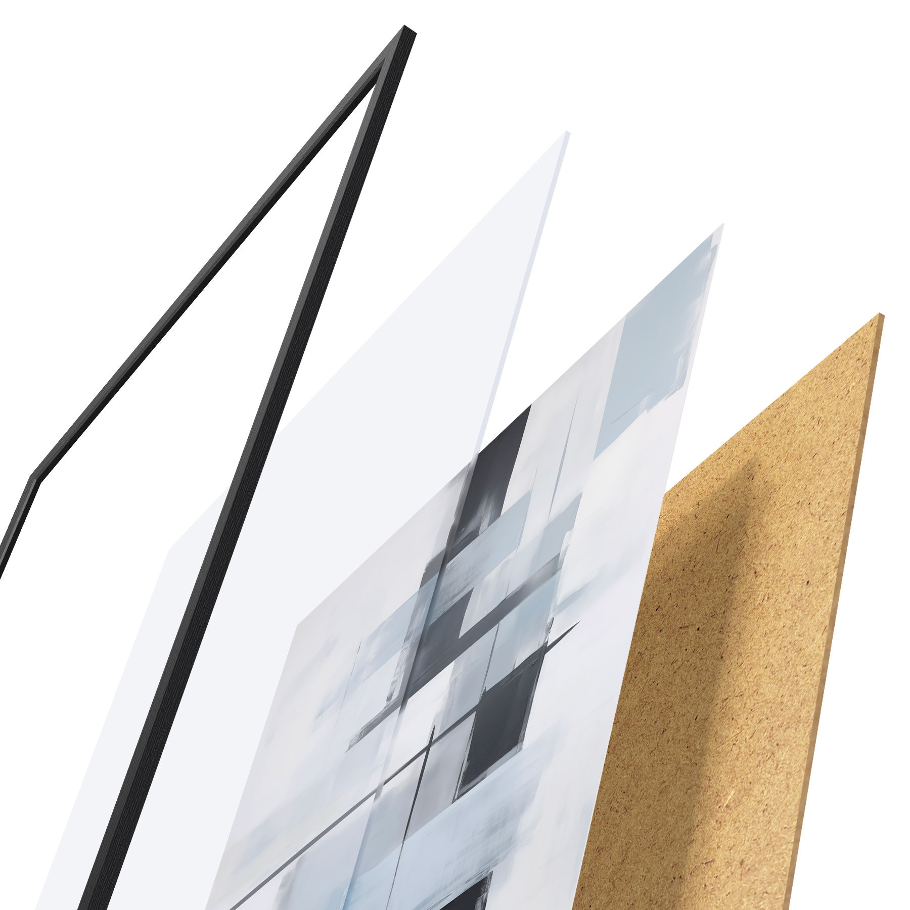 Plakát se skládá z rámu, plexiskla, tištěného obrazu a dřevotřískového podkladu. Díky úchytům na zadní straně lze plakát ihned zavěsit na zeď.