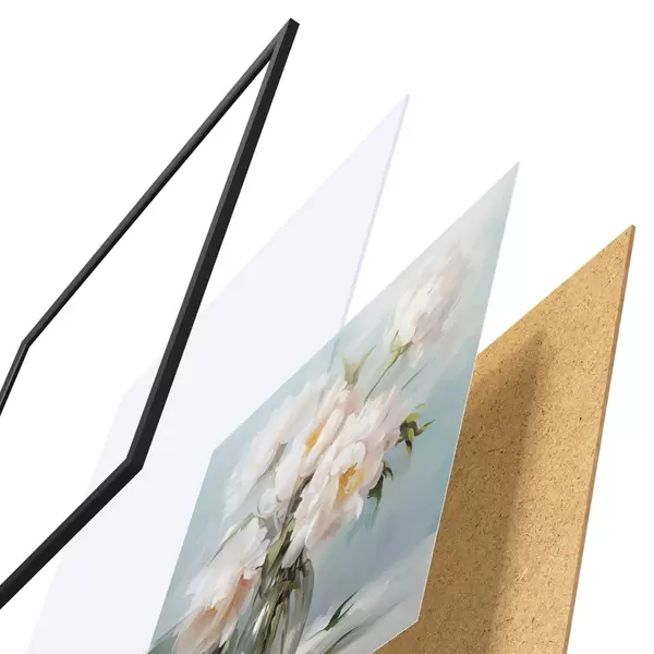 Plakát se skládá z rámu, plexiskla, tištěného obrazu a dřevotřískového podkladu. Díky úchytům na zadní straně lze plakát ihned zavěsit na zeď.