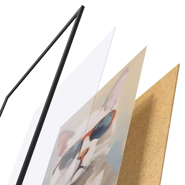 Plakát se skládá z rámu, plexiskla, tištěného obrazu a dřevotřískového podkladu. Díky úchytům na zadní straně lze plakát ihned zavěsit na zeď.