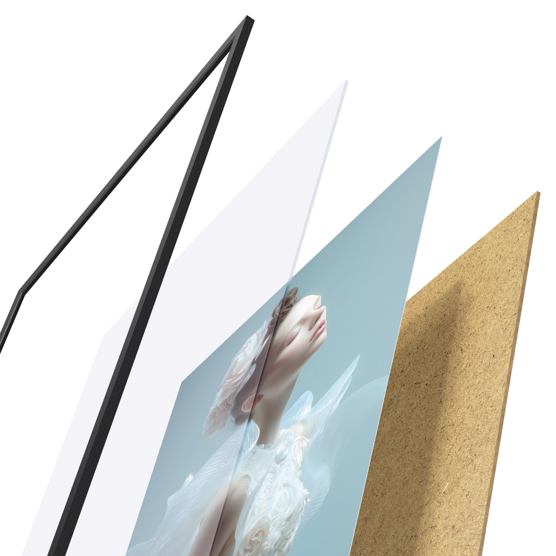 Plakát se skládá z rámu, plexiskla, tištěného obrazu a dřevotřískového podkladu. Díky úchytům na zadní straně lze plakát ihned zavěsit na zeď.