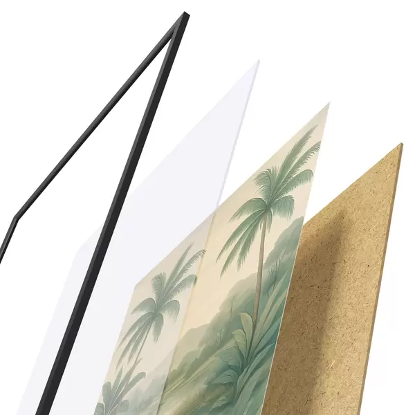 Plakát se skládá z rámu, plexiskla, tištěného obrazu a dřevotřískového podkladu. Díky úchytům na zadní straně lze plakát ihned zavěsit na zeď.