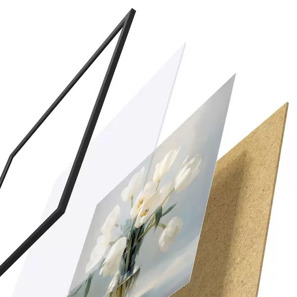 Plakát se skládá z rámu, plexiskla, tištěného obrazu a dřevotřískového podkladu. Díky úchytům na zadní straně lze plakát ihned zavěsit na zeď.