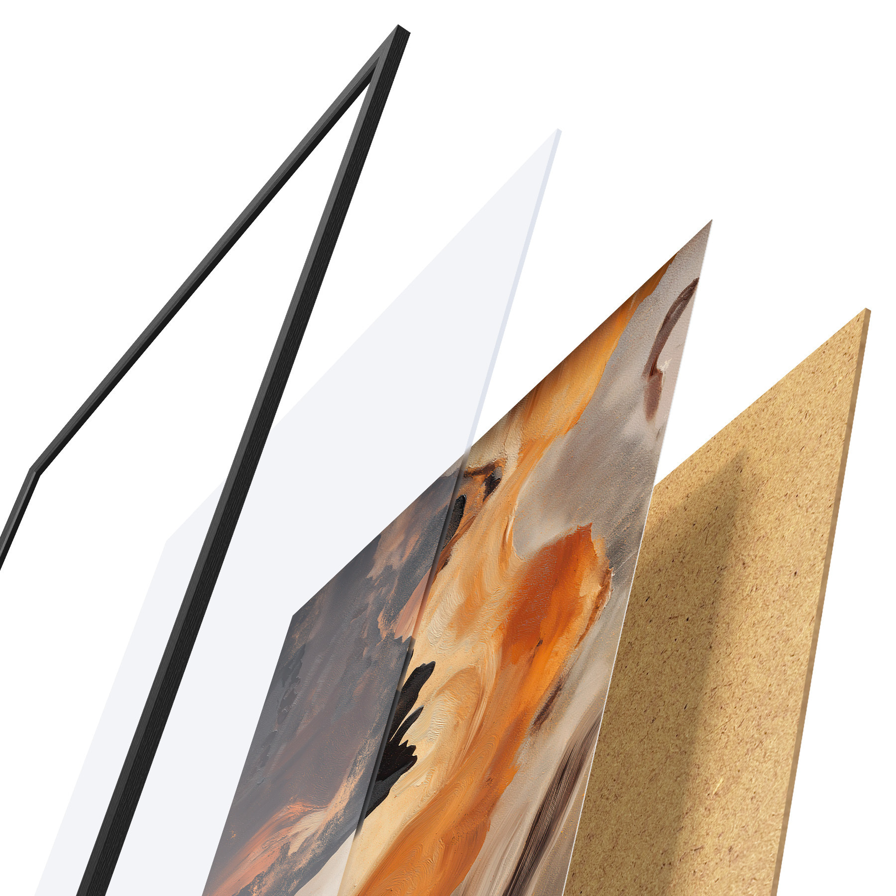 Plakát se skládá z rámu, plexiskla, tištěného obrazu a dřevotřískového podkladu. Díky úchytům na zadní straně lze plakát ihned zavěsit na zeď.