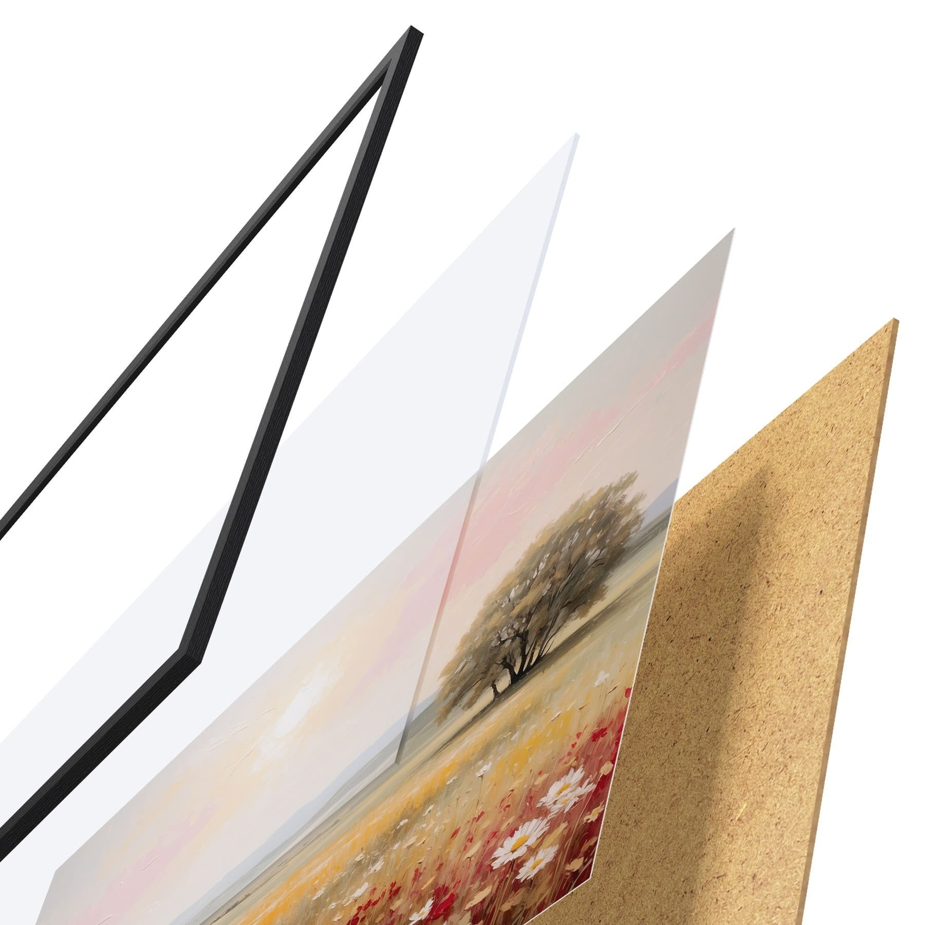 Plakát se skládá z rámu, plexiskla, tištěného obrazu a dřevotřískového podkladu. Díky úchytům na zadní straně lze plakát ihned zavěsit na zeď.