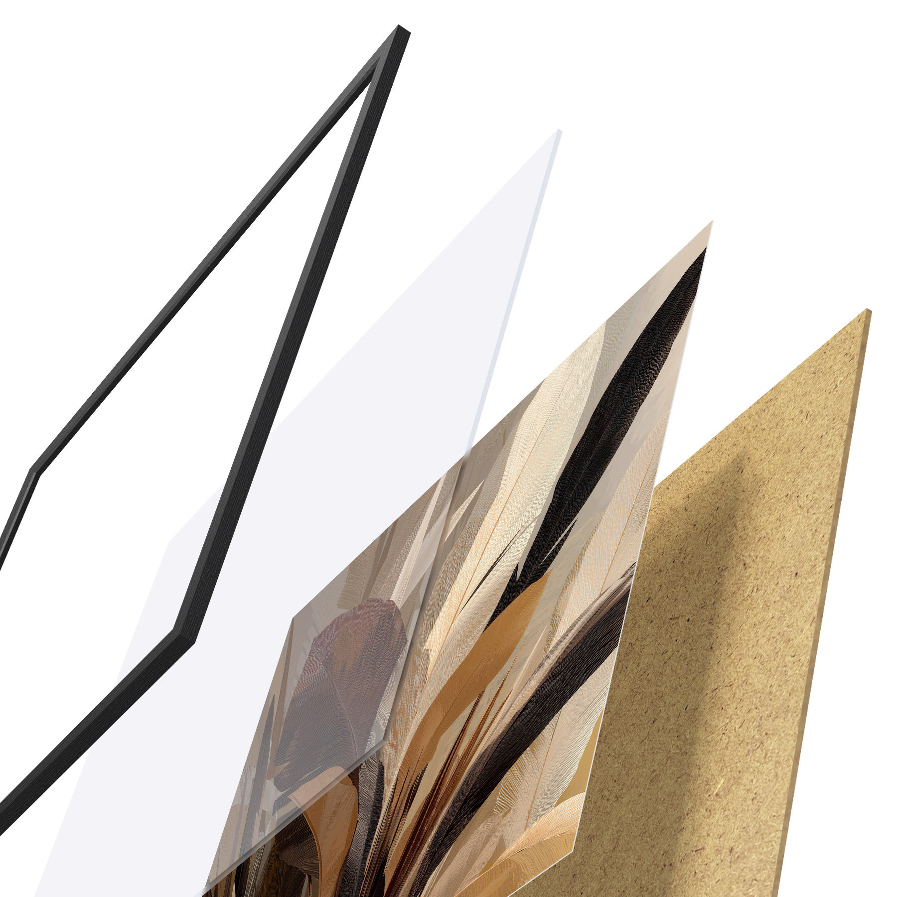 Plakát se skládá z rámu, plexiskla, tištěného obrazu a dřevotřískového podkladu. Díky úchytům na zadní straně lze plakát ihned zavěsit na zeď.