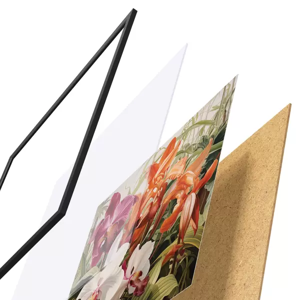 Plakát se skládá z rámu, plexiskla, tištěného obrazu a dřevotřískového podkladu. Díky úchytům na zadní straně lze plakát ihned zavěsit na zeď.