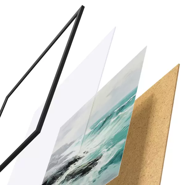 Plakát se skládá z rámu, plexiskla, tištěného obrazu a dřevotřískového podkladu. Díky úchytům na zadní straně lze plakát ihned zavěsit na zeď.