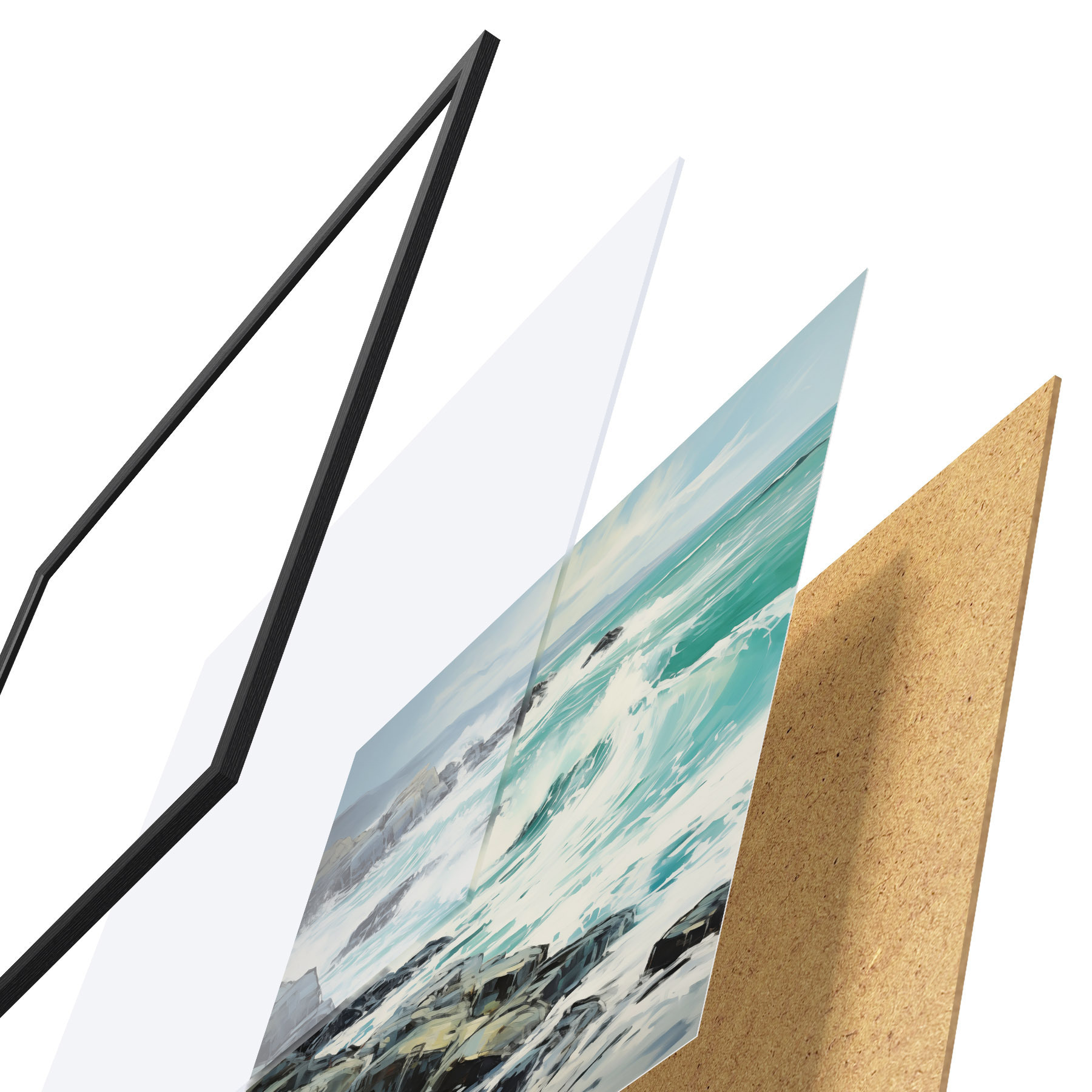 Plakát se skládá z rámu, plexiskla, tištěného obrazu a dřevotřískového podkladu. Díky úchytům na zadní straně lze plakát ihned zavěsit na zeď.